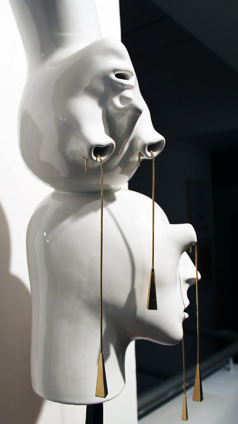 For example, I have several frozen ink installations,- a series of hands holding frozen ink popsicles. When the audience enters the gallery they find the art pieces melting before their eyes, until it reveals what's inside,- the ink. That way the sculpture becomes something ephemeral that is changeable,- something that generates different reactions and meanings for every individual. I also made another sculpture where I replicated my head in half butter, half ceramic. At the gallery opening, I dragged it all over the walls and erased half of the representation of my face completely. I decided then to make a mold of the leftover butterhead and cast it out of porcelain. Once slip-casted and fired, its size reduced considerably since the porcelain reacted to the heat of the kiln and from there it evolved into a third head. That became another mold that I slip-casted, fired, and reduced even more. I continued repeating this process of reduction over and over until it became a very small head and as a result of this process, it turned into butter again. The final installation resulted in a self-portrait, a reflection on my journey of life, and its fading memories.